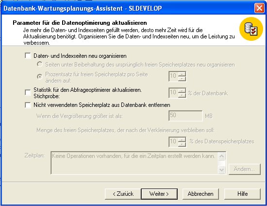 In diesem Dialog können Parameter für eine Optimierung der Datenbank gesetzt werden. In diesem Beispiel übergehen wir diesen Schritt. (Optimierungen sind eine tolle Sache aber auch nicht ohne Folgen, daher werde ich in einem anderen Artikel genauer drauf eingehen)