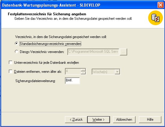 Im nächsten Dialog können wir das Festplattenverzeichnis für die Sicherung angeben. Als Standardverzeichnis nimmt der SQL Server das Verzeichnis "Backup" unterhalb der SQL Server Installation. Die Installation liegt häufig auf C: und da hat unsere Datensicherung nichts zu suchen, also ändern wir das Verzeichnis. Des Weiteren wollen wir, dass für jede Datenbank ein Unterverzeichnis erstellt wird, auch wenn wir in diesem Fall nur eine Datenbank "Sprudel" haben. "Aber das haben wir immer schon gemacht, also..." Dann wollen wir noch erreichen, dass Dateien die älter als 7 Tage sind entfernt werden. Das bedeutet natürlich umgekehrt, dass der SQL Server die Daten der letzten 7 Tage im Zielverzeichnis belässt. Da kann einiges zusammen kommen und es sollte daher VORHER geprüft werden, ob das noch passt oder uns der Server in den nächsten Nächten einfach überläuft und keine Sicherungen mehr laufen. Als Dateierweiterung belassen "*.bak" das ist schön eindeutig.