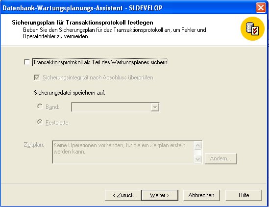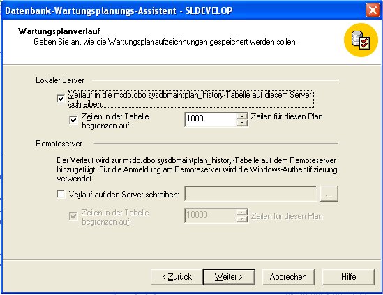 Und noch einen Klick auf "Weiter" kommen wir zum Wartungsplanverlauf. Eine sehr nützliche Funktion um sich später Wartungsereignisse anzuschauen. Wir belassen daher die Einstellungen.
