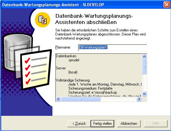 Und noch mal auf "Weiter". Und wir sind schon fast durch. Wir müssen dem Wartungsplan noch einen Namen geben. Einen besseren als "DB-Wartungsplan1", oder?