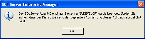 Nun auf "Fertig stellen" klicken und vielleicht weißt uns der Assistent noch freundlicherweise darauf hin, dass der SQLServerAgent nicht gestartet ist. Das holen wir gleich nach.