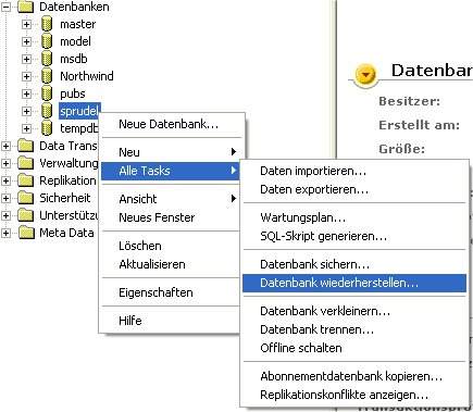 Für das Wiederherstellen der Beispieldatenbank "Sprudel" klicken Sie mit links auf die Datenbank und wählen im Kontextmenü unter "Alle Tasks" den Punkt "Datenbank wiederherstellen..." aus.
