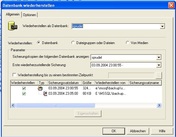 Es öffnet sich der Dialog "Datenbank wiederherstellen". In unserem Szenario ist der Sicherungsverlauf auf dem Server vorhanden und kann daher genutzt werden. Im Dialog muss zur Wiederherstellung der Datenbank "Sprudel" darauf geachtet werden, dass bei "Wiederherstellen als Datenbank:" die Datenbank ausgewählt wurde. Bei den Parametern muss natürlich bei "Sicherheitskopien der folgenden Datenbank anzeigen:" ebenfalls die Datenbank ausgewählt sein. Nun kann eine Datensicherung ausgewählt werden die zurückgesichert werden soll. In der Liste werden Details zur ausgewählten Sicherung anzeigt.